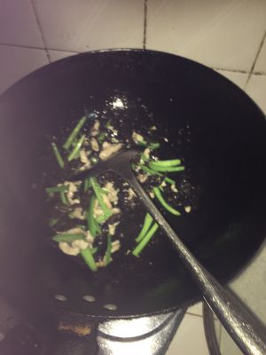 最后加入土豆丝(这里的土豆丝是代替笋的,家里没有笋,又懒得出去买,大家如果像我一样用土豆丝代替的话。要多洗几遍土豆丝,直至洗土豆丝的水变清。这样土豆才会像笋一样脆。还有就是最后加入土豆丝翻炒)