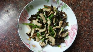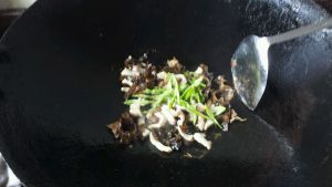 放入肉、木耳、笋、青红尖椒丝翻炒