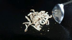 热锅倒油,把腌好的肉下锅,炒到肉丝变白色盛至盘中待用。