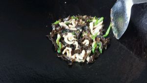 下葱姜蒜末,青椒,木耳入锅一起炒熟!