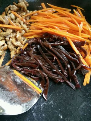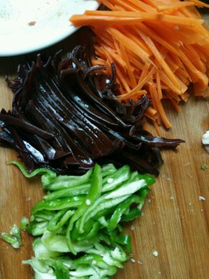 胡萝卜,木耳,青椒切丝,青椒切开再洗一下可去除少许辣味