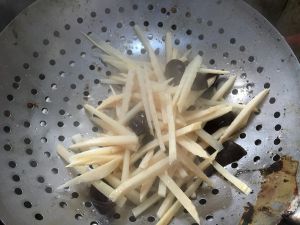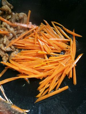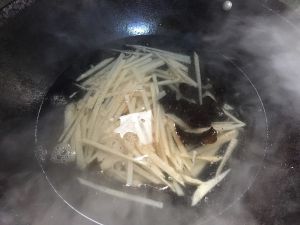 起油锅,放入土豆胡萝卜丝,炒六七分熟放青椒丝