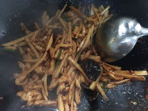 锅中留底油,放入茭白、胡萝卜、黑木耳。