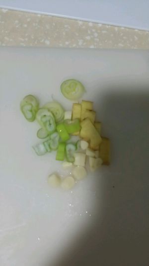 葱姜蒜切成大段,为了把肉腌渍好后,比较容易挑出它们扔掉。