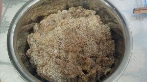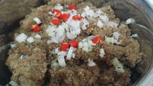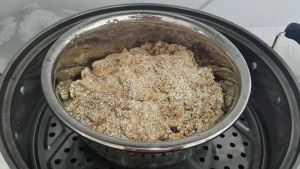 腌渍好后,再倒入五香蒸肉米粉,搅拌均匀。