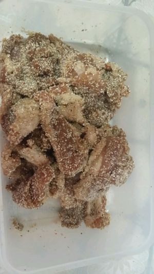 腌制猪肉。在肉上加甜醋,料酒,酱油,蚝油,姜末,糖。腌制半小时后就可以把肉裹上米粉啦