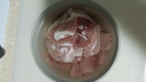 准备好五花肉和里脊肉,因为家里人有人不吃肥肉,所以加了里脊肉。把肉切片用水泡出血水。