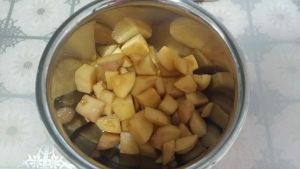 取一个大平盘,先摆上红薯块,红薯切滚刀块,是为了在铺盘时留下自然的空隙,方便红薯在蒸制的过程中更容易熟透。