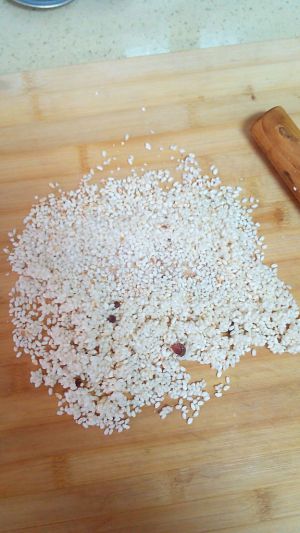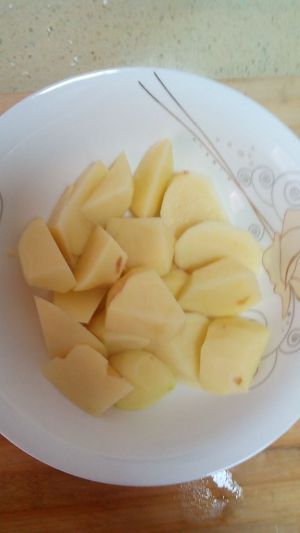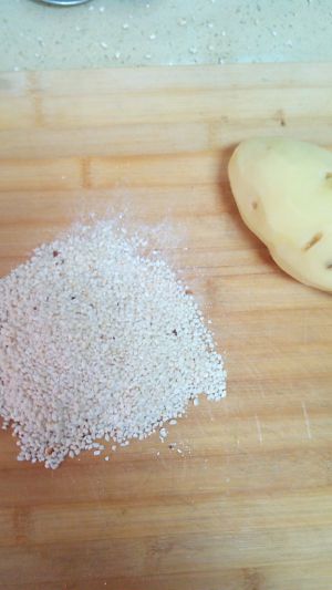 糯米用擀面杖碾碎,有颗粒更好。削一个土豆。