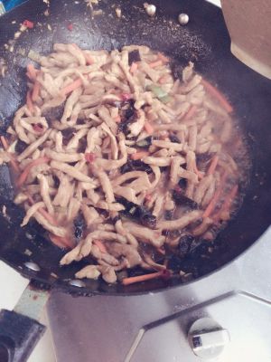 放入切好的胡萝卜木耳 肉丝 和调制好的料汁 翻炒