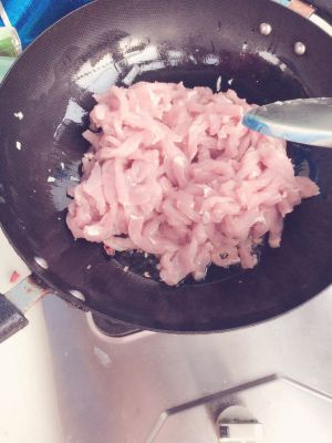 锅中倒油,然后倒入里脊肉,炒至变色,盛出备用。