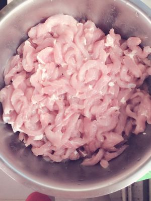 里脊洗净切丝,用少量盐、淀粉、少量水把肉丝抓匀,腌制几分钟