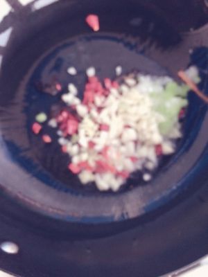锅中倒油,待油热倒入葱姜蒜末,再倒入辣子酱。