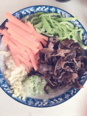 葱姜蒜切末 ,青椒胡萝卜木耳切丝,装盘备用