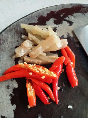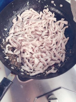 炒熟出锅前加入青椒丝 少量鸡精 加水淀粉勾芡