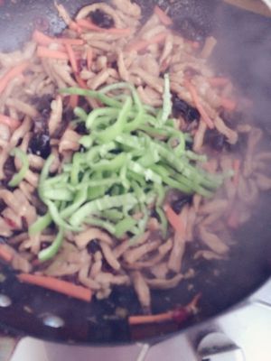 1. 少许油炒白肉丝盛出。2. 高温热油炒胡罗卜丝盛出。3. 将笋丝木耳丝炒熟后将肉丝胡罗卜丝全部倒入锅内,倒入调好的汁液,蠔油,收汁盛盘。