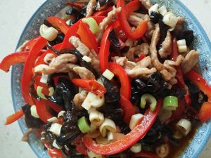锅中热油,放豆瓣 泡姜泡椒,出香味,放木耳红椒丝,翻炒,放肉丝,再翻炒,倒入调味汁,快速翻炒。肉丝裹上汁发亮,放葱末。关火,起锅,盛盘。