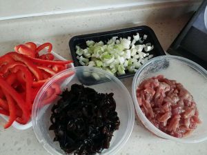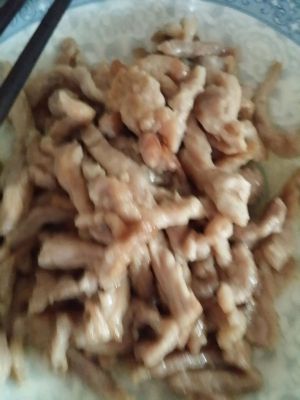 把肉切丝儿,然后加入淀粉、酱油和匀搁一边腌制一会