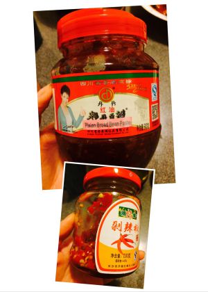 舀完肉锅里应该还有油吧,没有再加点,然后油锅里加入葱姜蒜爆香,再加一汤勺豆瓣酱,一勺泡椒酱,翻炒均匀【豆瓣酱和剁椒酱都需要,附图】