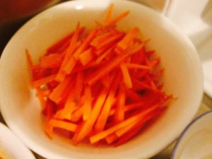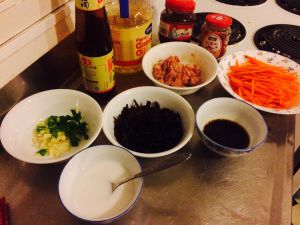 各种切切切。胡萝卜、木耳切丝儿,葱姜蒜切好准备