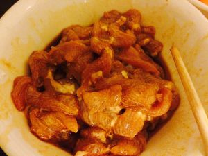 里脊切丝放料酒,酱油生抽,黑胡椒粉,耗油,抓匀,再放淀粉