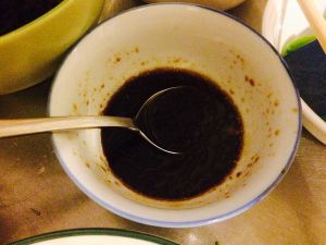 最重要的环节,调汁儿。酱油一汤匙,醋两汤匙,糖一汤匙,料酒一茶匙,盐1/2茶匙,香油1/2茶匙。全部放入碗里,搅拌均匀,备用