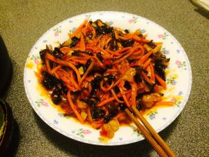 加入胡萝卜翻炒,胡萝卜快熟的时候加入木耳一起翻炒。然后差不多木耳也快熟了,就把之前舀出来的肉倒进锅里一起翻炒几下 (因为好像胡萝卜熟的比较慢,所以我先炒得差不多熟再放木耳)