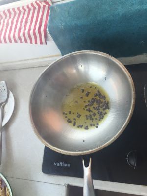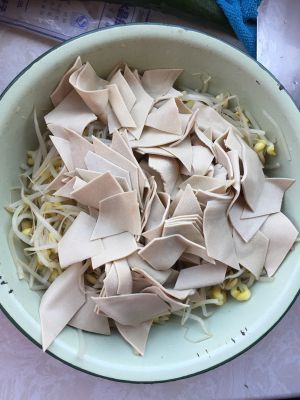 用油把麻椒炸一下,然后把麻椒一一挑出来…把蒜片,红尖椒放在豆片大豆芽上,浇麻椒油…