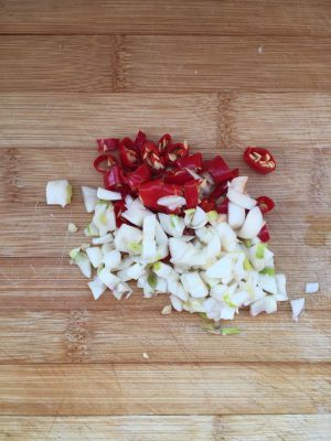 把之前炸好的辣椒和花椒放到肉上,再放上蒜沫,葱沫。在锅里倒上适量油,烧热,浇在上面就好啦!