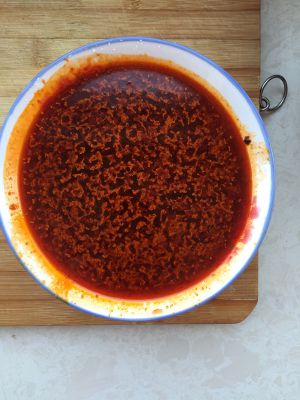 锅放油,小火。放入辣椒和花椒。有香味后捞出辣椒花椒备用,油留在锅里。