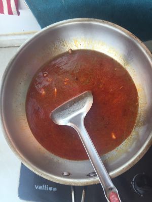 油热后放入豆瓣酱,炒出红油后,放入水和一个老母鸡浓汤宝,待水烧开。