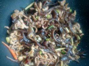 加入胡萝卜丝,木耳丝,尖椒丝翻炒两分钟,至胡萝卜目测变软(中火)