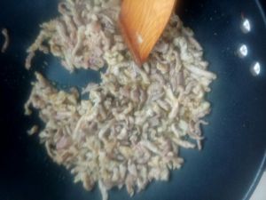 出香味后,倒肉丝翻炒至变色,盛出(不然肉会老)