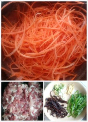 所有原料洗净,猪肉切条加入少许花椒粉抓匀,葱白切丝,胡萝卜切丝,蒜切末。
