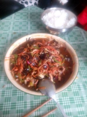 感觉醋和生抽被吸收进去了,加番茄酱吧,好几汤勺番茄酱,番茄酱翻炒几下就熟(十秒)