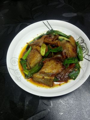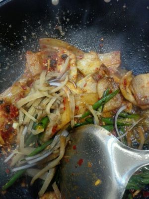 逼去多余的油,把肉片推向一边,油里下豆豉,姜丝,蒜片,炒香,下啤县豆瓣,炒出红油,翻炒均匀后,下腌大头菜丝,煸好的二荆条辣椒,翻炒3分钟。下生抽,味极鲜酱油,甜酱,鸡精,翻炒均匀。