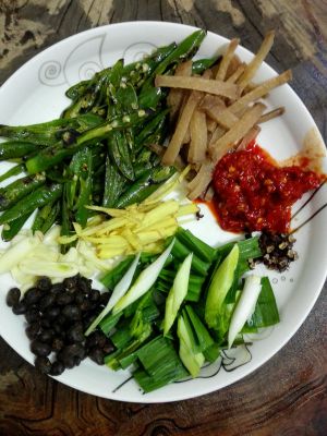 煮肉的时间,把姜切丝,蒜切片,腌大头菜切丝,蒜苗切节,二荆条辣椒切斜节下炒锅中干煸至微糊,豆豉,豆瓣,花椒备齐。