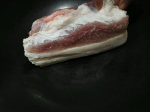 锅里少放一点油,加入五花肉片小火煸炒,炒至肉卷起来,颜色微黄即可,盛出