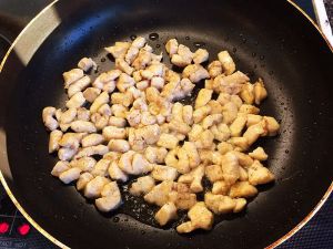 锅里倒少量油,加热后倒热腌好的鸡肉,等到鸡肉变色后盛出备用
