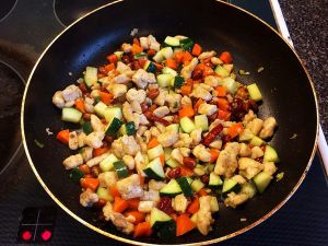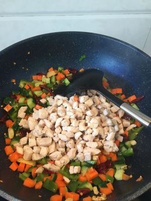 开盖后下入鸡肉丁,倒入酱汁。