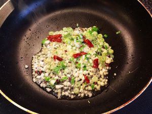 热锅冷油 下葱姜蒜和干辣椒 花椒煸香