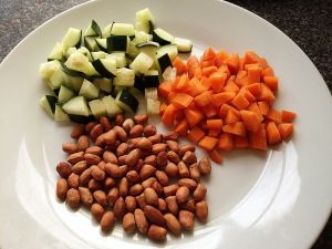 将胡萝卜,黄瓜切丁备用,花生米去皮可以用油炸一下,比较好去皮。备用