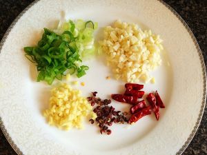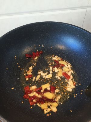 锅里重新倒油,将葱、姜、蒜、辣椒放进锅中翻炒