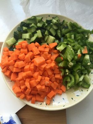 将洗干净的胡萝卜、黄瓜、青椒切成小丁备用