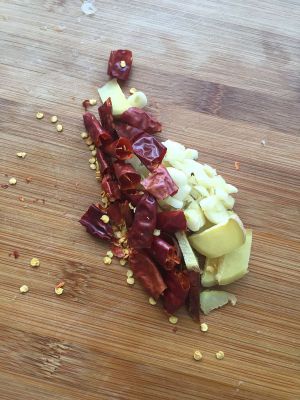 干辣椒、葱切段、姜、蒜切片备用;准备酱汁:2勺生抽、1勺老抽、1勺料酒、1勺醋、2勺糖、半勺盐