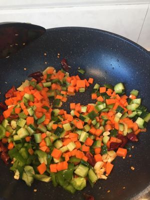 炒出香味后将胡萝卜、黄瓜、青椒丁放入锅中继续翻炒