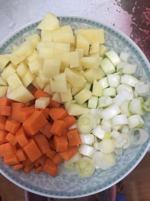 土豆,胡萝卜切丁,大葱切段备用
