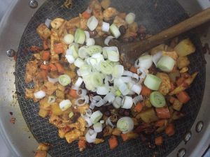 然后放入腌好的鸡丁,翻炒片刻,加入郫县豆瓣,加入大葱,糖,适量翻炒均匀,