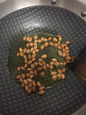 倒凉油入锅,放入去了皮的花生米,(花生米用开水一泡用手一撮就把皮去了)