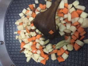 放入胡萝卜和土豆丁翻炒